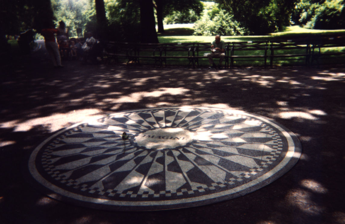 derrière elle, c'est le Dakota. Dans le parc, une mosaïque noire et blanche
